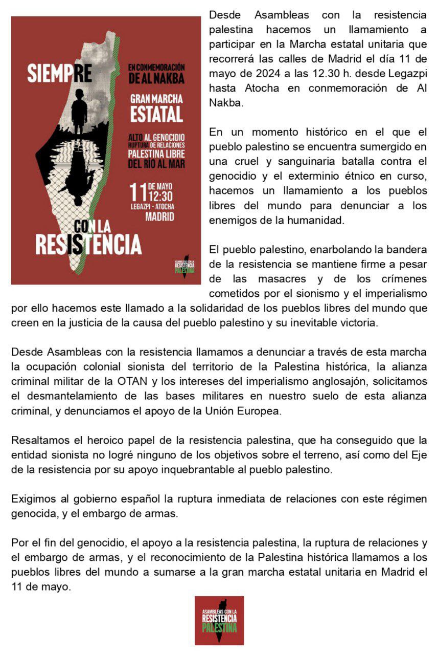 Desde Asambleas con la resistencia palestina, hacemos un llamamiento a participar en la Marcha estatal unitaria de apoyo a la resistencia palestina y en conmemoración del 76 aniversario de la Nakba palestina, que recorrerá las calles de Madrid el próximo sábado 11 de Mayo, de la Plaza de Legazpi a la Plaza del Reina Sofía (Atocha).