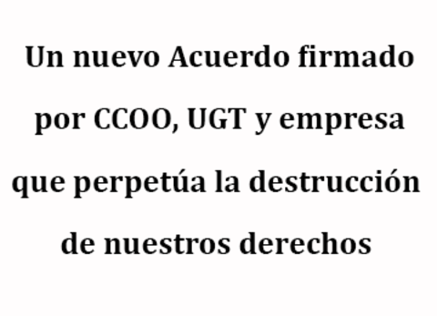 Pero los socios sindicales de la empresa van de “sobraos”. Saben, porque se lo explica y “vende” muy bien la empresa lo que necesitamos, y así firmaron el día 3 de febrero. SIN LA PARTICIPACION de los trabajadores/as, corriendo, con nocturnidad y alevosía. Sin tener en cuenta el deterioro y pérdida en derechos que nos está llevado a asumir Acuerdo tras Acuerdo una cantidad ingente de trabajo que mina nuestra salud.